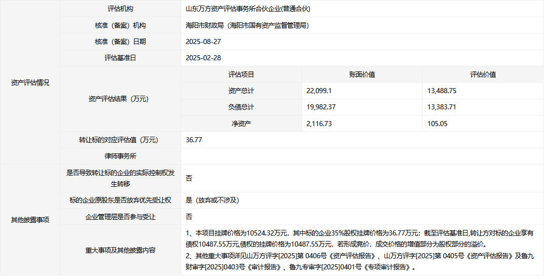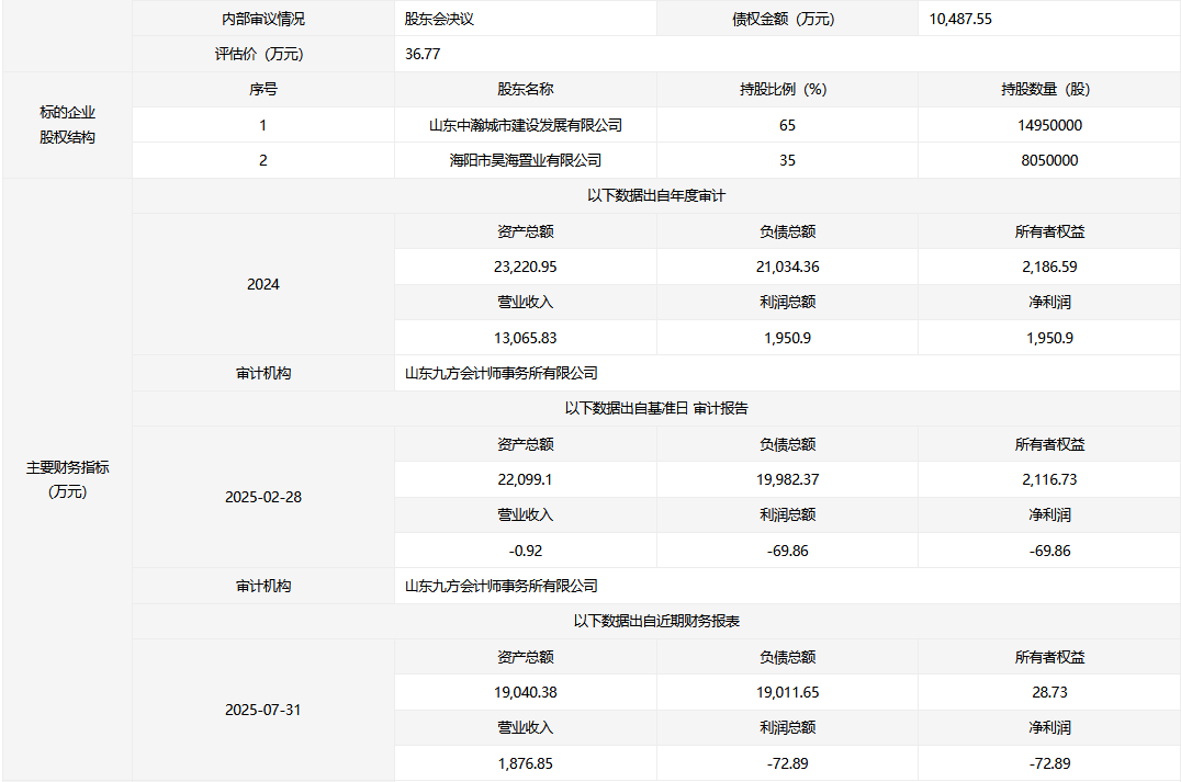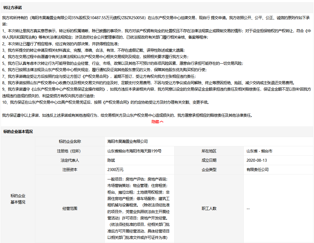 海陽(yáng)市昊瀚置業(yè)有限公司35%股權(quán)及10487.55萬(wàn)元債權(quán)