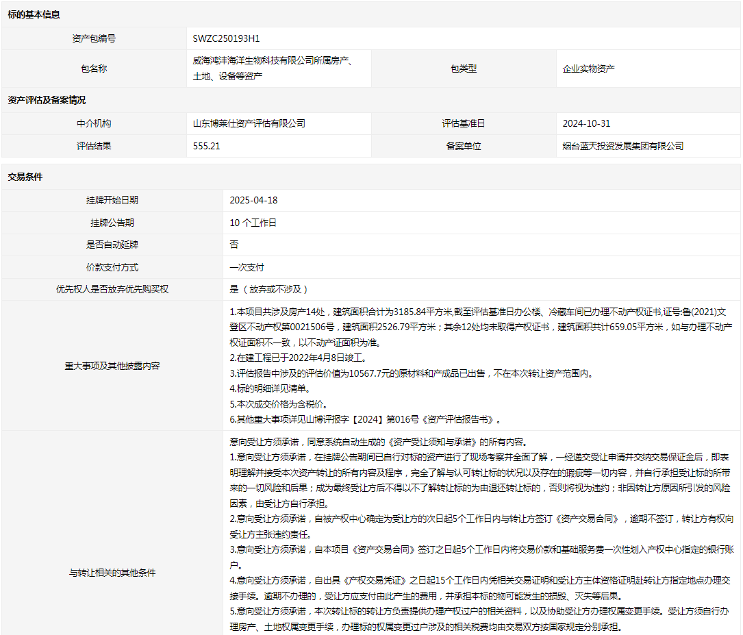 威海鴻灃海洋生物科技有限公司所屬房產(chǎn)、土地、設(shè)備等資產(chǎn)