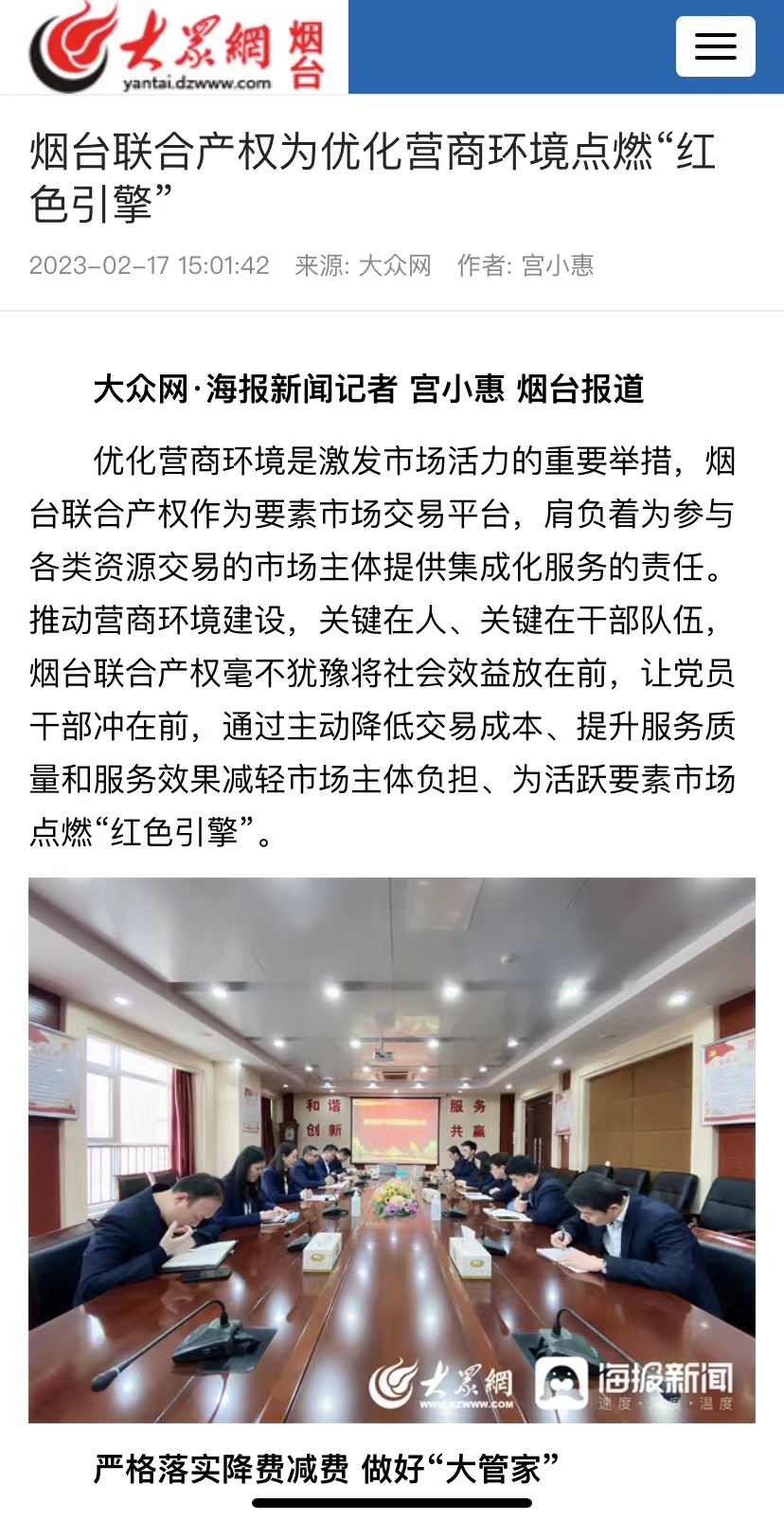 近日,“學(xué)習(xí)強(qiáng)國(guó)”煙臺(tái)平臺(tái)、煙臺(tái)日?qǐng)?bào)社大小新聞網(wǎng)、大眾網(wǎng)煙臺(tái)刊發(fā)署名文章《煙臺(tái)聯(lián)合產(chǎn)權(quán)為優(yōu)化營(yíng)商環(huán)境點(diǎn)燃“紅色引擎”當(dāng)好市場(chǎng)“店小二”》,全面介紹了2022年煙臺(tái)聯(lián)合產(chǎn)權(quán)作為要素市場(chǎng)交易平臺(tái),肩負(fù)著為參與各類資源交易的市場(chǎng)主體提供集成化服務(wù)的責(zé)任,在推動(dòng)營(yíng)商環(huán)境建設(shè)方面,毫不猶豫將社會(huì)效益放在前,讓黨員干部沖在前,通過主動(dòng)降低交易成本、提升服務(wù)質(zhì)量和服務(wù)效果減輕市場(chǎng)主體負(fù)擔(dān)、為活躍要素市場(chǎng)點(diǎn)燃“紅色引擎”。
