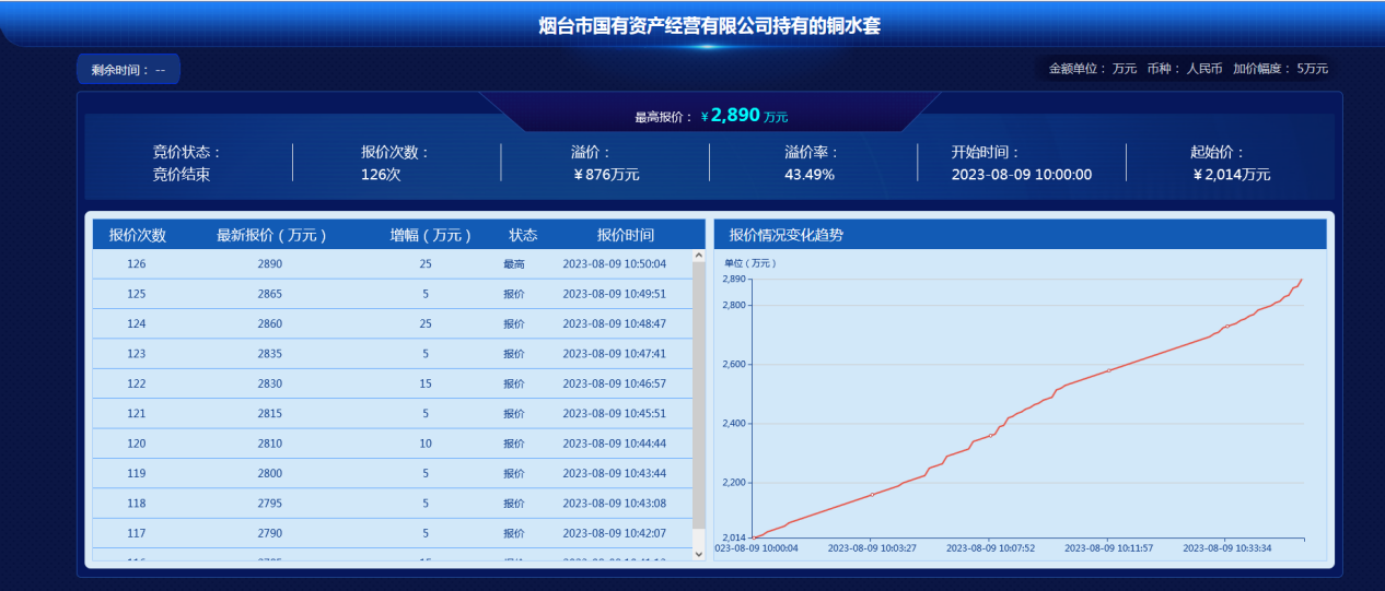 8月9日,煙臺(tái)市國有資產(chǎn)經(jīng)營有限公司持有的銅水套項(xiàng)目通過網(wǎng)絡(luò)競(jìng)價(jià)的方式公開競(jìng)價(jià),18名意向受讓方經(jīng)過126次激烈競(jìng)價(jià),最終以2890萬元的價(jià)格成交,溢價(jià)876萬元,溢價(jià)率43.49%。